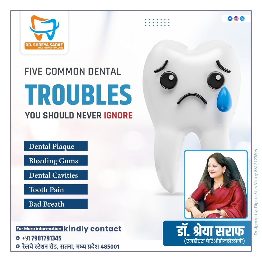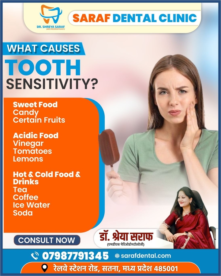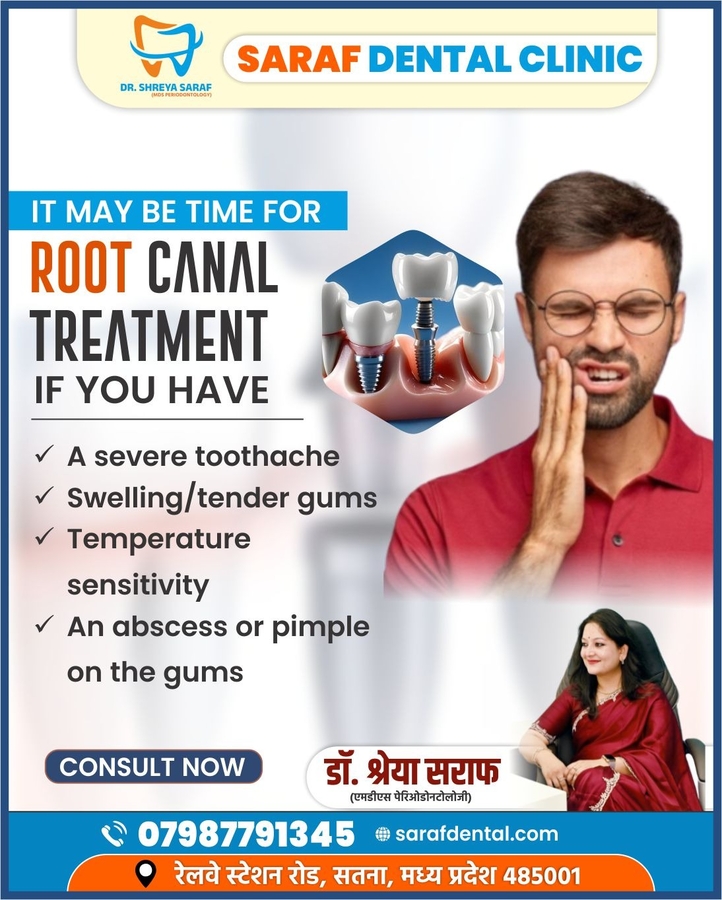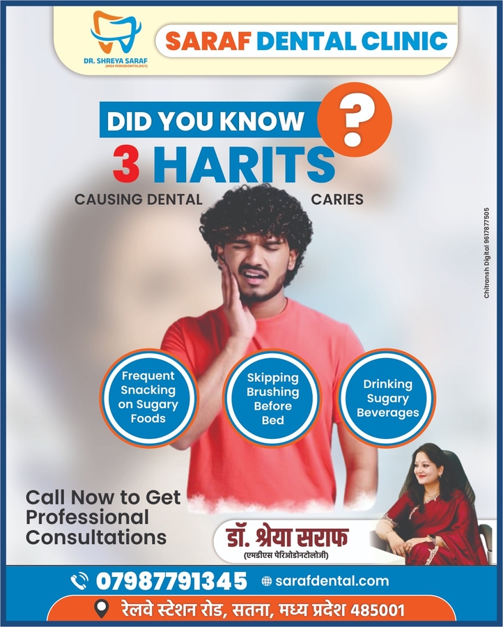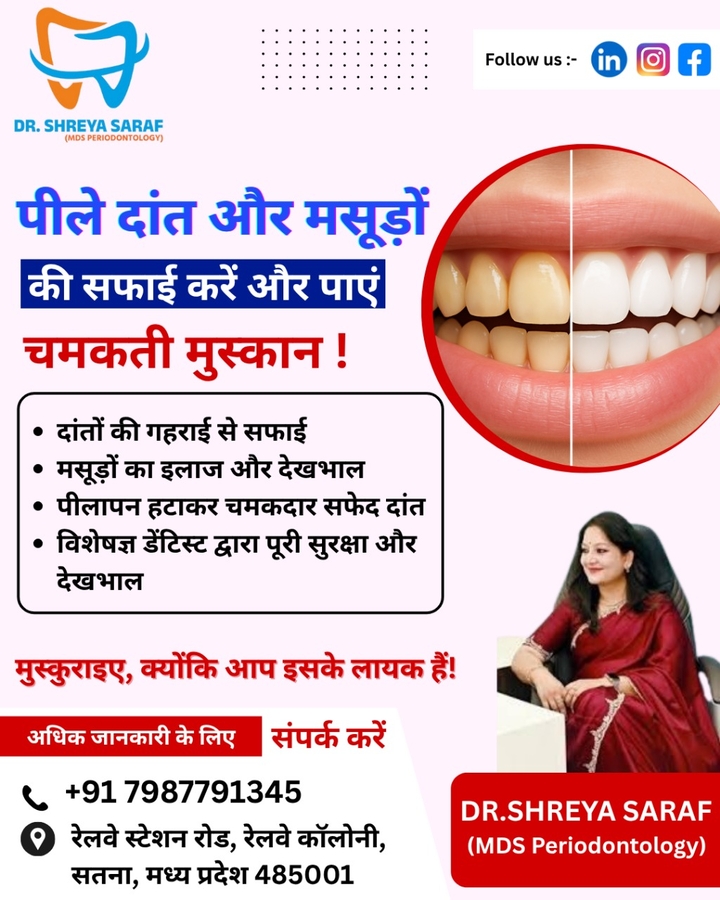 Saraf Dental Clinic, Satna, led by Dr. Shreya Saraf (MDS Periodontology), offers advanced and painless dental treatments for patients of all ages. We provide complete dental care including root canal treatment, dental implants, braces, crowns & bridges, teeth whitening, and cosmetic dentistry. Dr. Shreya Saraf is a trusted dentist in Satna, known for personalized treatment plans, gentle care, and modern dental technology. Our clinic focuses on comfort, safety, and long-lasting results. Visit Saraf Dental Clinic in Satna for quality dental care and book your appointment today.